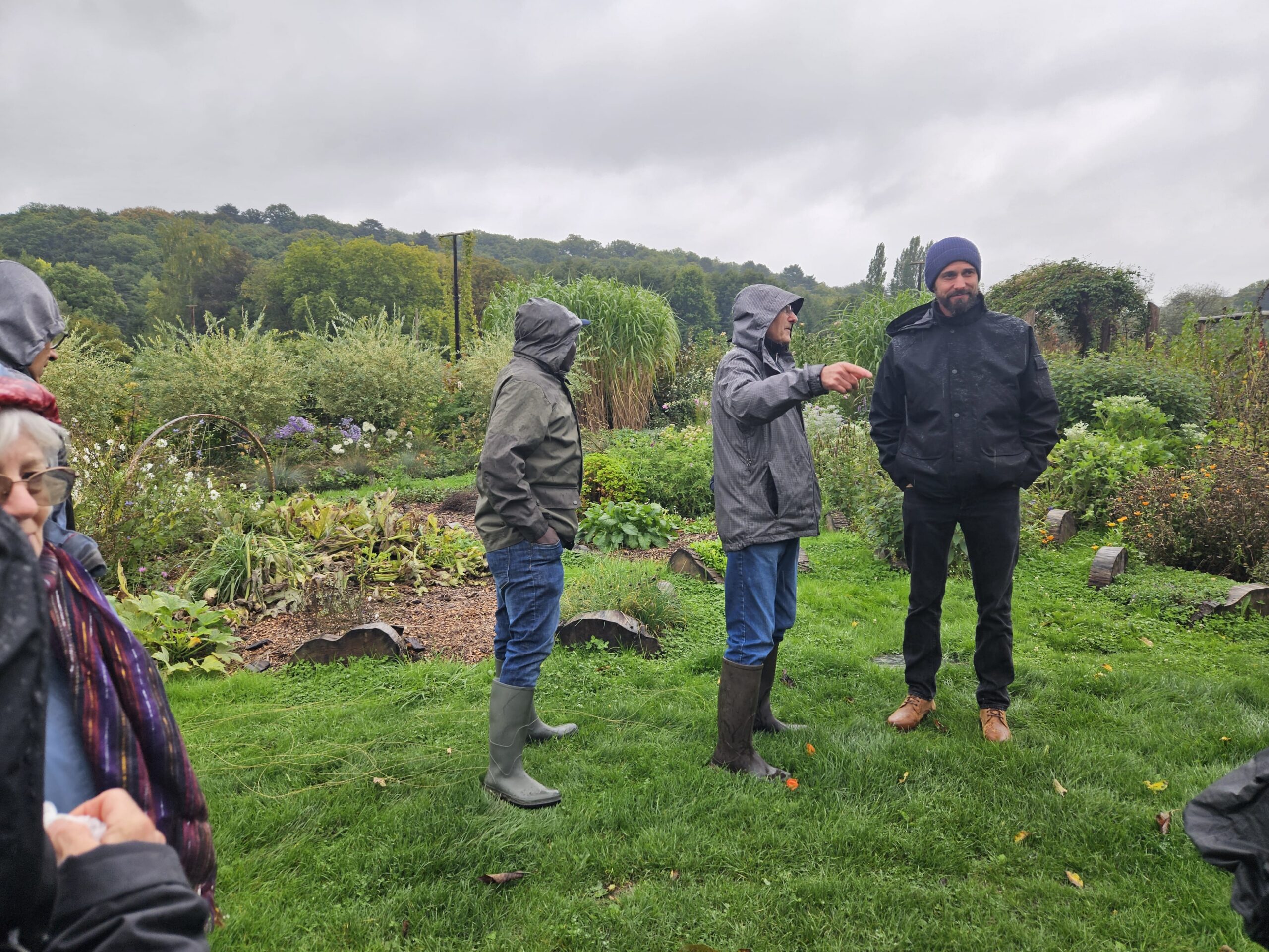 Tom nous a ensuite guidé, en partageant sa passion et ses convictions, dans son merveilleux jardin des partages, fruit de tout son parcours de vie varié et sinueux, visant à promouvoir et partager des pratiques de cultures durables (permaculture et agro-foresterie) imitant la nature et favorisant la vie du sol (couvert et nourri de broyat, feuilles, tonte, compost) et des auxiliaires (vers, champignons, insectes, oiseaux, …). jardin créé et entretenu à l’aide de nombreux woofers (apprenant ces pratiques en échange du gîte et couvert).