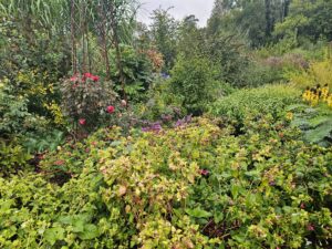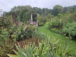 Son splendide jardin foisonnant et esthétique mêle harmonieusement arbres, arbustes, fruitiers, plantes, fleurs (dont nombre comestibles que nous avons goûtées), légumes, allées enherbées, haies et bassins.